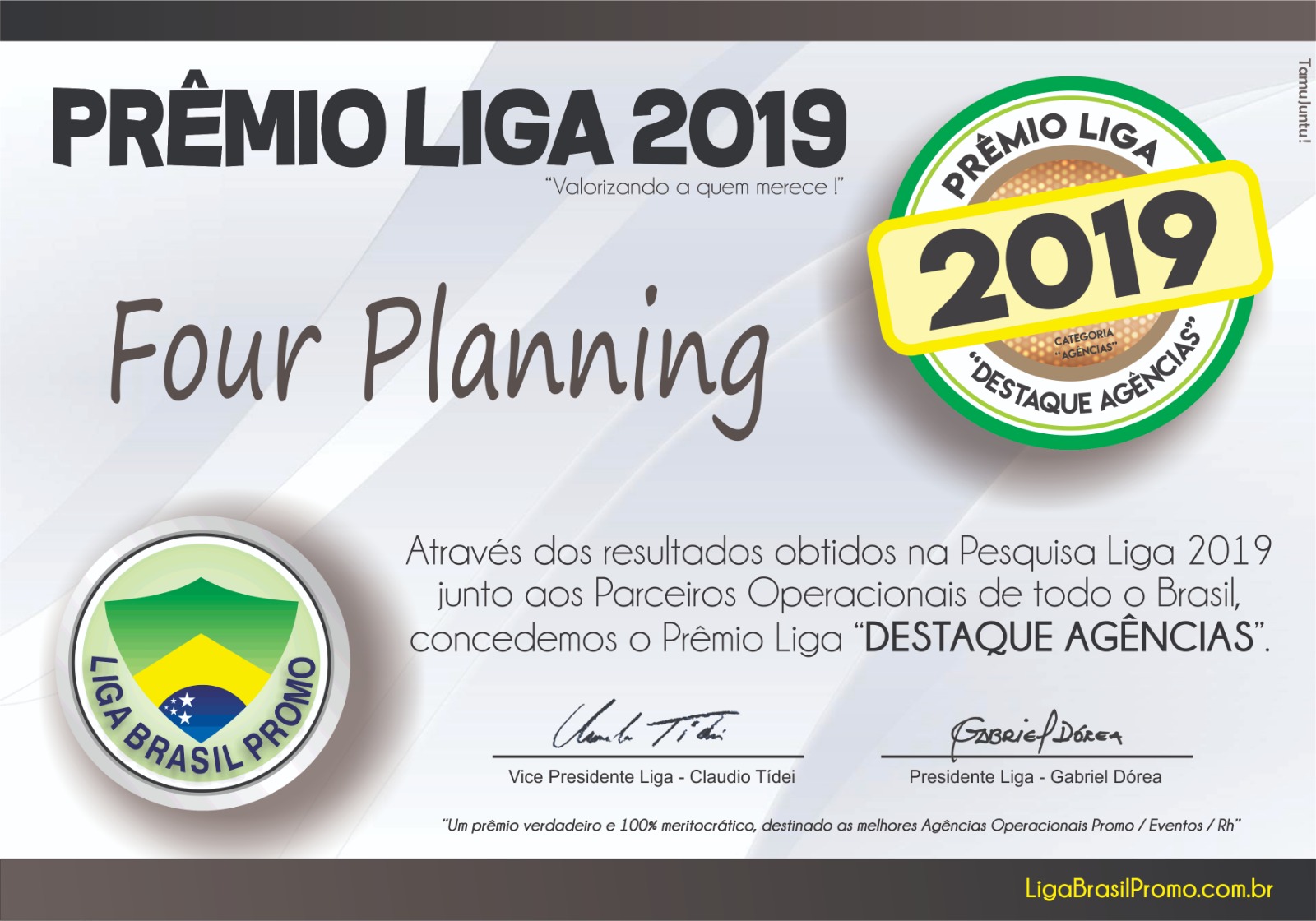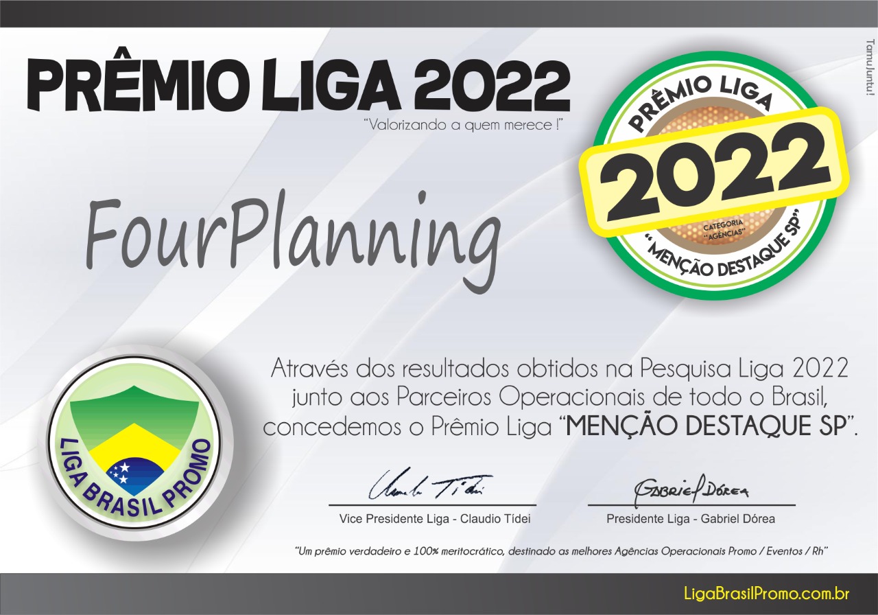 Com a realização de eventos que priorizam pela excelência e por parcerias eficientes, conquistamos o respeito e o reconhecimento de nossos clientes. Tudo isso, inclusive, nos possibilitou o prêmio de Agência Destaque, do Liga Promo, em 2019, que foi concedido junto aos parceiros promocionais de todo o Brasil.
